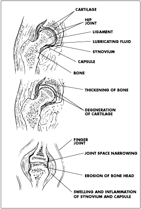![]() | Normal joint: Where two bones meet, our bodies normally provide a simple and effective lubricating system. Ligaments binding the bones together form a capsule within which a thin membrane called the synovium exudes a fluid lubricant. For good measure, the ends of both bones are cushioned by a smooth layer of cartilage.Osteoarthritis: In this form of arthritis, trouble begins when the protective cushion of cartilage between the bones slowly degenerates. As it disappears, the synovium and the ends of the bones thicken within the joint, leading to the aching stiffness that characterizes the disease.Rheumatoid arthritis: The culprit here is the synovium, which for unknown reasons becomes swollen and inflamed, leading to irreversible damage to the joint's capsule and protective cartilage. Eventually the unprotected ends of the bones themselves begin to erode. |