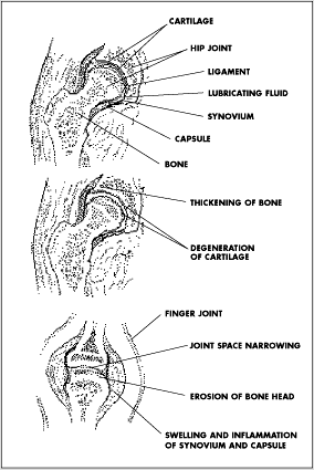 ![]() | Normal joint: Where two bones meet, our bodies normally provide a simple and effective lubricating system. Ligaments binding the bones together form a capsule within which a thin membrane called the synovium exudes a fluid lubricant. For good measure, the ends of both bones are cushioned by a smooth layer of cartilage.Osteoarthritis: In this form of arthritis, trouble begins when the protective cushion of cartilage between the bones slowly degenerates. As it disappears, the synovium and the ends of the bones thicken within the joint, leading to the aching stiffness that characterizes the disease.Rheumatoid arthritis: The culprit here is the synovium, which for unknown reasons becomes swollen and inflamed, leading to irreversible damage to the joint's capsule and protective cartilage. Eventually the unprotected ends of the bones themselves begin to erode. | |