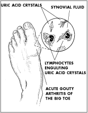 Gout and Food: A Proven Link Gout is the only form of arthritis that is unquestionably linked to diet, although the number of people whose gout can be blamed entirely on what they eat is small. For a victim of gout, foods high in substances called purines, such as liver, kidney, fish roe, mussels, anchovies, peas, beans, pancreas and brain, add to the existing problem of elevated levels of uric acid in the blood. Drinking too much alcohol and crash dieting can also raise the level of this acid. The uric acid that the body either overproduces or can't get rid of forms into tiny crystals like shards of glass which float in the joint space. When the immune system attacks these crystals, inflammation occurs. |