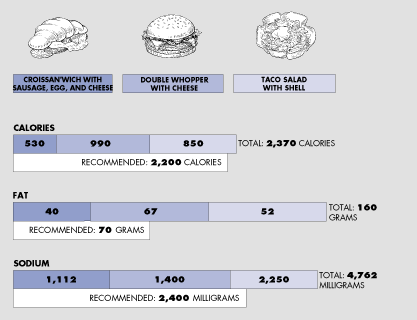 | If you were to take all three of your meals in fast food outlets—and make some really bad choices—your nutritional profile for the day would look like the graph above. Although your calories would be more or less in line, you would have eaten more than double the recommended amount of fat and nearly double the recommended amount of sodium. And that's not counting fries and dessert! The moral: While you don't have to completely give up those fat-laden burgers and breakfast sandwiches, you don't want to make a habit of them either. | |||||